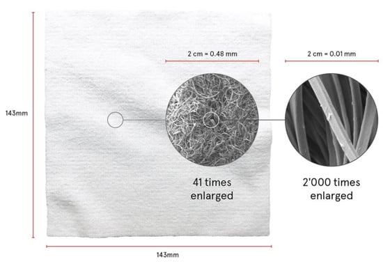 When moistened before use, the active substances disperse in water but remain in the wipe through the capillary capacity of the textile structure. The application on the skin presses water and dispersed substances onto the skin thus liberating active substances from the wipe. While water vaporizes lecithin and the active substances remain on the skin. At the same time, the microfiber structure of the wipe cleanses and softly exfoliates the skin. Figure 1 shows the wipe and the structure of the filaments in different magnifications.