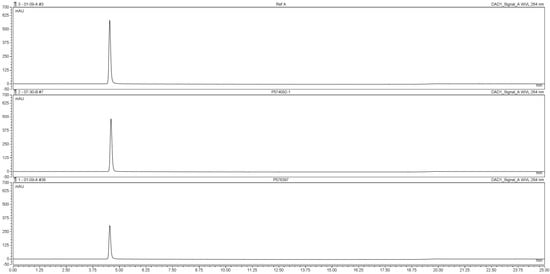 HPLC chromatograms of niacinamide reference solution (top), sample solution from quality control (middle) and sample solution from used wipe (bottom).