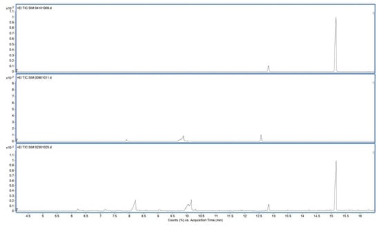 GC-SIM total ion chromatograms of reference solution (top), sample solution from unused wipe (middle) and sample solution from used wipe (bottom).