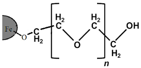 The PEG coating on SPIONs (M-PEG) is known as one of the important carriers in the biomedical field due to its reasonable saturation magnetization and high surface area [23,24]. In addition, the polymeric shell prevents the agglomeration of nanoparticles, increases stability and biocompatibility, and decreases biological toxicity and side effects. Liang et al. have used nanoparticles coated with polyethylene glycol to deliver doxorubicin [25] or polyarabic acid for the delivery of anticancer drugs [26]. The bond between the polymer and the surface of iron oxide is schematically depicted in Figure 1 [27]. The presence of a hydrophilic, PEG coating on the surface of SPIONs has a vast number of biological advantages, such as increasing the shelf life of the drug in the body, slowing down the breakdown of the nanocarriers by metabolic enzymes or their elimination by the immune system, and preventing nanoparticle removal [28].