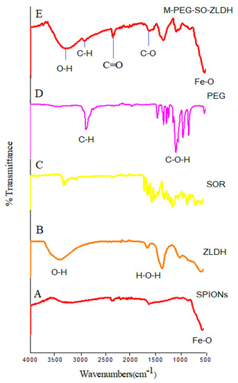FTIR spectra for (A) superparamagnetic iron oxide nanoparticles; (B) pure ZLDH; (C) pure sorafenib; (D) pure PEG; and (E) drug-loaded magnetic nanoparticles (M-PEG–SO–ZLDH).