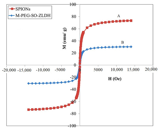 The maximum magnetic saturation for the SPIONs was found to be 73 emu/g compared to 30 emu/g for the M-PEG–SO–ZLDH nanoparticles. A very low value of Hci for the synthesized magnetic nanoparticles confirmed their mono-regional characteristic. It was clear that the increase of the coating agents on the SPIONs resulted in the value of saturation magnetization also decreasing. As can be observed, the hysteresis curves for both the samples are S shaped, since the synthesized sample could be a mixture of Fe3O4 with relatively high magnetic saturation and a minor amount of non-magnetic materials [46]. This is presumably due to the decline in the saturation magnetization. The higher saturation magnetization (Ms) value of the Fe3O4 nanoparticles compared to that of their drug-loaded magnetic nanoparticles could be attributed to the presence of polymer and other materials and also to the remaining impurities on the surface of Fe3O4 nanoparticles.