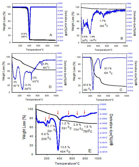 Thermogravimetric/differential thermogravimetric analyses (TGA/DTG) thermograms of (A) pure PEG; (B) superparamagnetic iron oxide nanoparticles; (C) pure sorafenib; (D) pure Zn/Al LDH; and (E) drug-loaded magnetic nanoparticles (M-PEG–SO–ZLDH).