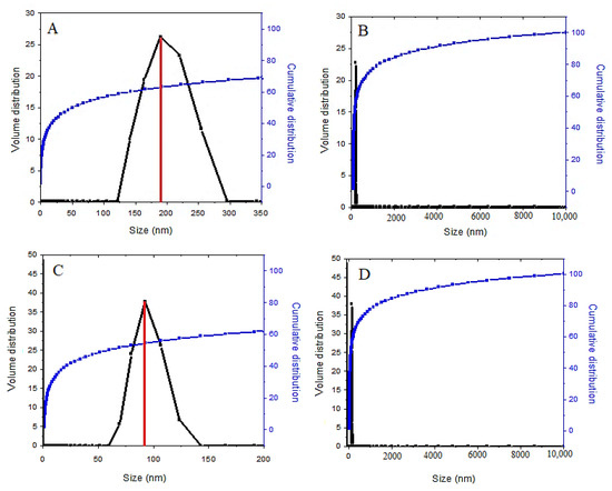 The relative (A) and cumulative (B) particle size distribution of superparamagnetic iron oxide nanoparticles; the relative (C) and cumulative (D) particle size distribution of drug-loaded magnetic nanoparticles (M-PEG–SO–ZLDH).