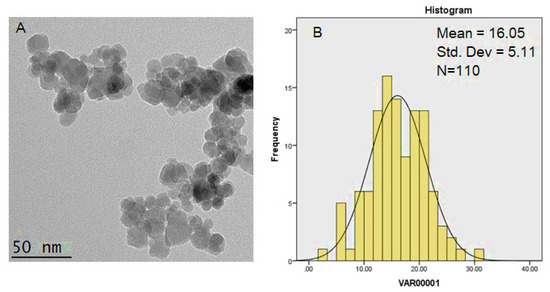 The particle size distribution was determined using image analysis software (Image J) from 110 particles selected randomly. As shown in the figure, the estimated drug-loaded magnetic nanoparticles’ mean diameter is around 16 nm with a narrow particle size distribution, which is ideal for the drug nanodelivery application. It could be inferred that the nanoparticles were of single crystal, and since the superparamagnetic iron oxide particles become single domain and monopolar in the sizes below 50 nm, the drug-loaded magnetic nanoparticles were also of single domain and monopolar. Additionally, the synthesized nanoparticles have a spherical morphology and near-uniform structures.