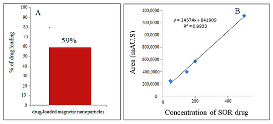 To determine the percentage of anticancer drug loaded on the magnetic nanoparticles, first, a standard curve was prepared using various concentrations (0, 25, 50, 100, 150, and 200 ppm) of sorafenib. Then the drug-loaded magnetic nanoparticle solution was put in methanol and then exposed to ultrasound for 1 h. The percentage of sorafenib in the drug-loaded magnetic nanoparticles was measured by high-performance liquid chromatography (HPLC) with a photodiode detector array and with a mobile phase containing acetonitrile and phosphate-buffered solution at pH = 7 with a flow rate of 1.5 mL/min, with column C18 Agilent (3.9 × 150 mm). The percentage of drug loading for sorafenib in M-PEG–SO–ZLDH compound was found to be 59% (Figure 9A) using the standard curve, indicating the successful internalization of the drug in the coating layer of the nanoparticles.