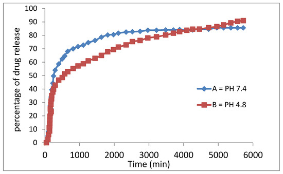 The study of the drug release pattern from the drug-loaded magnetic nanoparticles indicates that the drug release is slow as expected, indicating that the presence of the coating agents played an effective role to slow down the drug release. This is because the drug needed more time to pass through the barrier, the surface layers, and the release was found to be around 91% and 85% within 5700 min for pH = 4.8 and pH = 7.4, respectively (Figure 11).