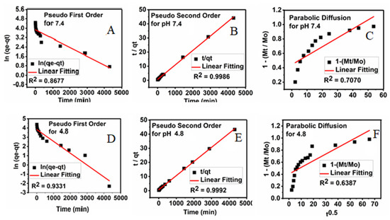 The kinetic release studies can be used to describe the change in the concentration over time to investigate factors that affect the reaction rate. For this, first-order Equation (1), pseudo-second-order Equation (2), and parabolic diffusion Equation (3) release kinetic models were used, and the amount of the drug released into the PBS solutions at pH 4.8 and pH 7.4 at the preset time was determined using the UV/Vis spectroscopy, and the results are shown in Figure 12.
