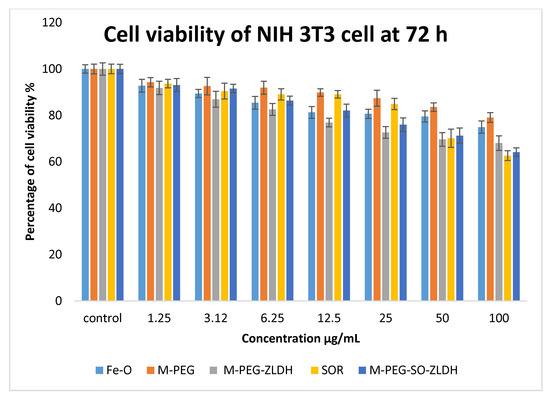 Cell cytotoxicity studies were conducted by treating the Fe–O, M-PEG, M-PEG–ZLDH (the nanocarriers), pristine sorafenib, and M-PEG–SO–ZLDH with normal fibroblast, 3T3 cells. Various gradient concentrations of the samples were incubated for a maximum of 72 h with the 3T3 cells. Figure 13 shows the percentage cell viability of the 3T3 cells after 72 h incubation for all the samples. All of the samples show 80% of cell viability in the range of concentration for Fe–O (1.25–50 µg), M-PEG (1.25–100 µg), M-PEG–ZLDH (the nanocarriers) (1.25–6.25 µg), pristine sorafenib (1.25–25 µg), and M-PEG–SO–ZLDH (1.25–12.5 µg) and were found to be biocompatible and nontoxic after 72 h incubation. This suggests that the designed anticancer nanoparticle formulation is biocompatible with normal cells and would be very useful for targeting cancer cells without damaging/harming normal tissues. The statistics, ANOVA, revealed that no significant difference was found among the sample groups at the individual from 1.25 to 12.5 µg concentrations using ANOVA and Duncan’s multiple range test.