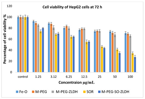 The anticancer activity of Fe–O, M-PEG, M-PEG–ZLDH (the nanocarriers), pristine sorafenib, and M-PEG–SO–ZLDH samples on liver cancer cells, HepG2, was studied, and the results are shown in Figure 14. Different concentrations of the above samples were incubated with liver cancer cells, HepG2, for 72 h. The empty nanocarriers Fe–O, M-PEG, and M-PEG–ZLDH from the concentration of 1.25–25 µg did not show any inhibitory action against liver cancer cells, HepG2. The IC50 of the pristine sorafenib against liver cancer cells, HepG2, was found to be 21.58 μg/mL compared to 15.66 μg/mL for the M-PEG–SO–ZLDH nanoparticles. The effective IC50, which is the actual amount of sorafenib present in IC50 of the anticancer nanoparticle was calculated from the percentage of the drug loading, which is 79% for M-PEG–SO–ZLDH. This was determined using HPLC analysis. These results suggest that M-PEG–SO–ZLDH nanoparticles at 15.66 μg/mL have much better anticancer activity compared to that of the pristine sorafenib drug. The M-PEG–SO–ZLDH nanoparticles were found to be significantly different from all the other samples at concentrations of 1.25–100 μg/mL with (P-values of <0.5).