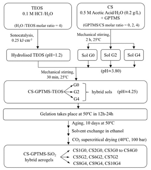 CS-silica and CS-GPTMS-silica hybrid aerogels were fabricated with different compositions using the sol-gel method by mixing two precursor sols. The first one made of hydrolysed TEOS with the stoichiometry acid water and the second one was prepared by mixing low molecular weight chitosan and GPTMS (where necessary) in aqueous acetic acid solution. The diagram in Figure 2 summarizes the key steps of the complete synthesis process.