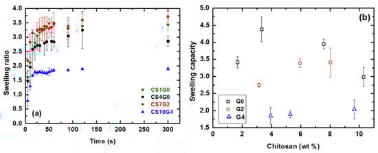 The ability of hybrid samples to absorb phosphate buffered saline (PBS) solution was examined and the swelling curves for selected samples are reported in Figure 5a. All the experiments were done in triplicate to ensure reproducibility. As a general rule, it was observed that increasing the concentration of GPTMS decreases the swelling capacity [57] thus the aerogels presented total absorbed mass ratios ranging between 3.75 and 1.75 for CS7G2 and CS10G4, respectively. It is worth to note that these two samples were mechanically stable in the swollen state, exhibiting characteristic of class II hybrids. Instead, for CS1G0 and CS4G0 (class I hybrids), the swelling process provoked the appearance of multiple cracks at swelling equilibrium although they showed similar swelling capacities of 3.50 and 2.75, separately. These results highlights the importance of the mechanical control during swelling, to develop technical applications based on these samples [32,58]. These features will be studied in more detail in Section 3.7.