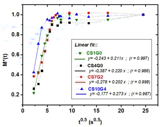 The absorption behavior was described by the normalized absorption ratio M*(t) vs. t. It was found that the variation of the sample mass showed a root dependency of t, typical of fast imbibition of liquids by capillary rise, considering a rigid porous structure [51,59]. Also, it was observed that imbibition occurs almost instantaneously and is followed by a final regime toward saturation. The four representative curves for selected samples CS1G0, CS4G0, CS7G2 and CS10G4 are depicted in Figure 6 and all of them followed the t classical-time dependence.