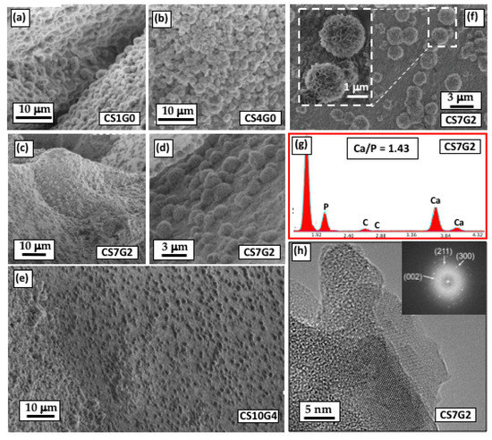 TEM-EDX and selected area electron diffraction (SAED) pattern confirmed these results. Hence, HRTEM micrograph (Figure 7h) of CS7G2 sample revealed the existence of nanocrystals randomly distributed in the hybrid amorphous matrix, in the size range of about 10–15 nm, probably formed in early stages of the biomineralization of biomimetic apatite. These observations suggest the existence of active surface sites (Si–OH) which promoted nucleation and growth of diverse calcium phosphates, mainly HAp. TEM-EDX microanalysis supported this hypothesis, giving Ca/P ratios between 1.57 and 1.99 from different nanocrystals. Additionally, the small area electron diffraction (SAED) pattern from HRTEM image (inset of Figure 7h) shows bright spots according with the presence of calcium phosphate nanocrystals. In this sense, the d-space for (211), (300) and (002) planes were identified (e.g., d-space for (211) sample was 0.280 nm, in good agreement with standard JCPDS (09-0432) files of HAP). From these observations, it can be concluded that the formed crystals are HAp particles in the precipitation and dissolution process of the apatite layer.