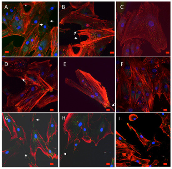The focal adhesion complexes consists of integrin and actins vertically separated by a core that includes cytoskeletal elements such as vinculin [60,61,62,63]. As shown, mature focal adhesions appear in experimental groups, initially on the tips of filopodia and in the leading edge lamellipodia after 72 h (Figure 9, Figure 10 and Figure 11). While in control cells a certain turnover can be appreciated, with small focal adhesions, in experimental groups the FA complexes maturated, together with a higher expression of stress fibers, as described by us and others [60,62,64,65,66], as an expression of reduced cell migration and of the initial steps cell differentiation. After 1 week the percentage of mature and intermediate size FAs increased, together with a well-developed stress fiber network including a significant number of mature focal adhesions, mainly in cells grown on CS10G4 samples.