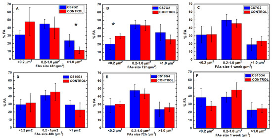 Percentage of FAs according to size. Comparative analysis between cells grown on CS7G2 and control groups at (A): 48 h hours in culture; (B): 72 h hours in culture; (C): 1 week in culture; and cells grown on CS10G4 and controls in (D): 48 h hours in culture; (E): 72 h hours in culture; (F): 1 week in culture (*: p < 0.005).