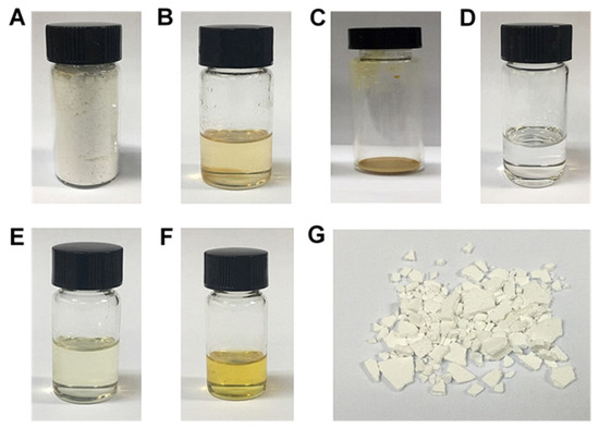 Images of poly (3-hydroxybutyrate) (PHB) and polyethylene glycol (PEG). (A) PHB powder. (B) synthesized poly (3-hydroxybutyrate) (S-PHB). (C) Extracted PHB (E-PHB) or extracted and purified PHB (EP-PHB). (D) PEG. (E) Liquid product of reaction of PHB powder and PEG under room temperature. (F) Liquid product of reaction of PHB powder and PEG under 150 °C. (G) PHB bulk.