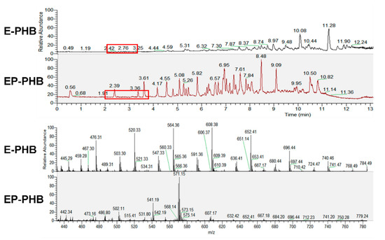 HPLC-MS spectrum of E-PHB and EP-PHB oligomer.