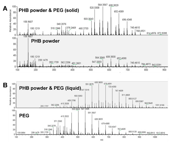 The mixture of PHB powder and PEG after treatment under 150 °C possesses higher antibacterial reduction than each of the individual components. Some antimicrobial agents, such as reactive oxygen species [21], and radical [22] and new molecules [23], may be produced as a result of possible chemical reaction between the mixing components, leading to a better antimicrobial effect than each individual component. To see if this hypothesis was true or false, the mass spectrum (MS) was carried out for the solid and liquid part of mixture of PHB powder and PEG after heat treatment, as well as the individual PHB powder and PEG after heat treatment under 150 °C for 4 h. It can be seen from Figure 4A that there is no difference between PHB powder and the solid part of mixture of PHB powder and PEG after heat treatment, which means that no new solid antimicrobial component is produced after the reaction of PHB powder and PEG under high temperature. Similarly, the mass spectra of liquid part of mixture of PHB powder and PEG are compared with those of PEG in Figure 4B, showing no new chemical component is produced, whereas the average degree of polymerization of PEG increases approximately from 11 to 14 after heat treatment, and the corresponding number-average molecular weight increases from 540 to 673, illustrating the further polymerization of PEG rather than reaction with PHB power. Therefore, the hypothesis of generation of new antimicrobial components fails due to the constant chemical component observed by MS.