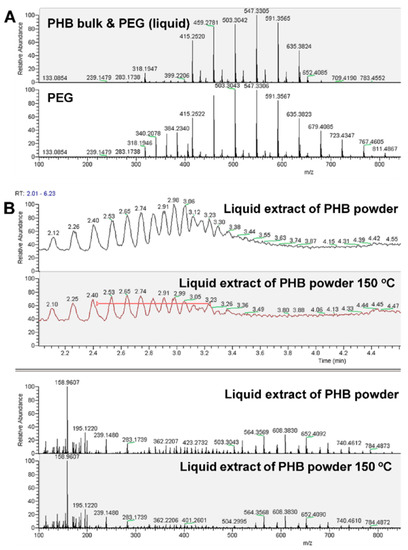Actually, as the melting temperature of PHB is about 180 °C [24] and the thermal degradation temperature is over 190 °C [25], the heat treatment under 150 °C is insufficient for degrading the PHB macromolecules, even if it is in the powder state with high specific surficial area. Figure 5B exhibits the mass spectrum of liquid extract of raw PHB powder before and after heat treatment, showing that only PEG with low degree of polymerization exists, rather than the PHB oligomer through thermal degradation.