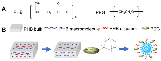 Schematic illustration of hypothesis of dissolution/dispersion of PHB oligomer by PEG. (A) Chemical structure of PHB and PEG. (B) Two steps are presented as dissolution/dispersion and synergistic antimicrobial effect.