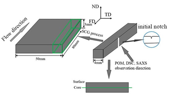 Thin slices with thickness of 30 μm were cut from different samples at the same position by a microtome. Then the slices were observed by a DX-1 (Jiang Xi Phoenix Optical Co., Shangrao, China) microscope connected with a Canon 500D digital camera (Canon, Tokyo, Japan), and the observation direction for POM was parallel to transverse direction (shown in Figure 1).