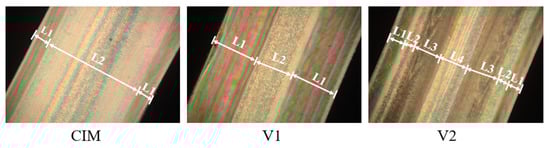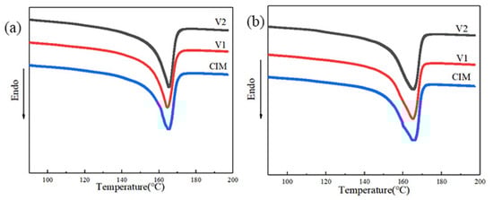 The sample prepared by CIM manifests a typical skin–core structure, which is in agreement with the previous papers published before [2], while sample V1 and V2 show special microstructure observed from Figure 2. It should be noted here that the thickness of shear layer of samples V1 and V2 is almost the same (about 55%), indicating the same content of shish-kebab for these two samples, because it was speculated that the shear layer consisted fully of shish-kebab structure. More detailed information about the microstructure of all the samples, such as crystalline morphologies, orientation degree, the content of β crystal, have been reported in our previous literature [29]. Here, we can reasonably conclude that manipulated microstructures with different shear layer distributions could be obtained for the parts through MFVIM.