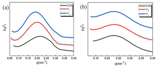 Corresponding intensity profiles of 1D-SAXS for different samples as a function of the scattering vector (q): (a) shear layer; (b) spherulites layer.