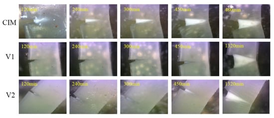 Figure 5 shows the patterns of the evolution of crack propagation of samples under a low initial stress for different times at 50 °C. Note that there are some dots in this figure, which is induced by some impurities or bubbles. We can clearly observe that the evolution of the slow crack growth for sample CIM is relatively rapid compared to the other two specimens, the sample completely fractures only within 507 min, which indicates the poor capacity of the resistivity of the material to the slow crack propagation behavior. The phenomenon could be explained by the low content of shish-kebab in the sample manufactured by conventional injection molding. Compared with sample CIM, the total fracture time of sample V1 climbs from 507 min to 1380 min originating from the high content of shish-kebab structure induced by the extra imposed shear field, which is consistent with the previous work [11]. These two samples underwent a complete fracture process under the experimental conditions used in this work. The difference of fracture process in the initial stage between samples V1 and V2 is considerably slight as illustrated in Figure 5. Surprisingly, the fracture behavior of sample V2 (shown in Figure 5) at the later stage is totally different from V1, showing multiple microcracks except for the original notch in this sample, indicated by the presence of stress white region, which is absent in the sample CIM and V1. The loading that the initial notch suffered would be shared through the formation of microcracks, leading to the suppression of slow crack growth. The reason why the stress white region formed will be discussed in a later section.