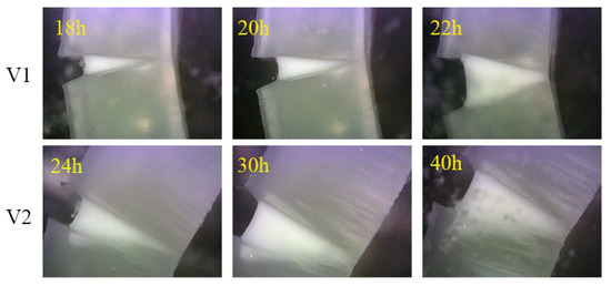 Figure 6 manifests the patterns of crack propagation of sample V1 and V2 at the later stage to furtherly reveal the different fracture process. It can be well observed that stress white region is distinctly obvious for sample V2 when the fracture time is over 24 h, but not for sample V1. Sample V1 would undergo the complete fracture process under the low initial stress without microcracks formed. Here, it should be noted that the deformation of sample V2 along the tensile direction had reached the measuring limit of SCG device after subjected to the low stress for 2400 min, originating from the formation of numerous microcracks at the later stage. The reason why there are not obvious microcracks could be observed at the early stage may be attributed to the long induction period that defects propagate into microcracks under the low stress. We could speculate that the microcracks formed during the slow crack growth process can prominently decrease the stress at the initial crack tip. That is to say, the stress loaded on the sample can be shared with a large number of microcracks besides the initial notch, which enhances the resistivity of this sample to the SCG process to a large extent. It is of practical or scientific significance for the development of polymer science and engineering. Hence, we can have a reasonable vision that the sample with such a novel shear layer–spherulites layer alternated structure could lengthen the service life of the products under some conditions.