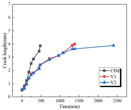 Figure 7 quantitatively characterizes the crack growth process by introducing the crack length versus time curves. It could be well observed that sample CIM shows rapid crack propagation, indicated by fracture within a short time. As for the other two samples, they possess similar fracture process in the early fracture stage, but the crack growth behavior is extremely different during the later fracture stage, the crack propagation of sample V2 was suppressed showing the independence of time during the later stage, which is consistent with the result of Figure 5 and Figure 6.