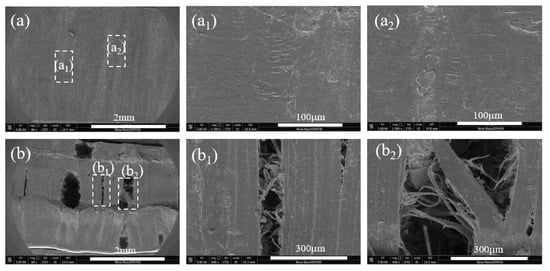In order to get more detailed information about the fracture morphology of sample V1 and V2 after the SCG process, Figure 8 presents its SEM images, and the observation direction of SEM is the transverse direction as shown in Figure 1. The extremely different morphologies for sample V1 and V2 can be well observed. The sample V1 (shown in Figure 8a) manifested relative smooth surface with the absence of microcracks. It should be noted clearly that the sample V2 does not fracture completely after suffered the SCG process for a very long time, and there are many stress white regions throughout the specimen. Corresponding to the POM photograph presented in Figure 2, it can be known from Figure 8b that microcracks formed in the spherulites layer but not the shear layer due to the inferior properties for spherulites. Figure 8(b1,b2) show the magnification of morphologies at corresponding locations in Figure 8b. A large amount of microcracks can be observed more clearly, which further confirms the existence of microcracks in this sample. Here, the reason why microcracks formed only in the spherulites layer for sample V2 will be discussed later to provide a promising way to manufacture robust plastic parts to meet the requirements of industry.