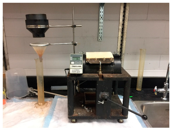 A bench-scale crown press (Phipps & Bird Inc., Richmond, VA, USA) was used to simulate belt filter presses used in industry for sludge dewatering (Figure 1). This equipment has two stages for separation: gravity thickening followed by belt pressing. In the gravity thickening step, a double-layered woven fabric was used as the filter placed on top of a filter holder. Biosludge was poured onto the filter and the filtrate was collected in a graduated cylinder. The wet residue from the gravity filtration was collected for mechanical compression where it was placed in between two press filters, sequentially increasing applied force on the residue for 10 s at 80 lb, 120 lb, and 150 lb. The pressed residue or cake was weighed before and after drying in the oven to determine its total solid content (TS) and infer the performance of the conditioner.