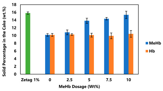 Using MeHb resulted in a statistically significant (p < 0.05) change in the particle size, especially for smaller particles to average size particles. However, comparing to the particle size change by using Zetag8165, this shift appears to be small and does not explain the change in the dry solids content and hence the improvement in the dewaterability. It seems that instead of the aggregation of the bigger particles, methylated hemoglobin may cause smaller particles in the size range of 0–40 µm (shown in Figure 4) to adhere to the larger particles, which explains the small change in particle size.