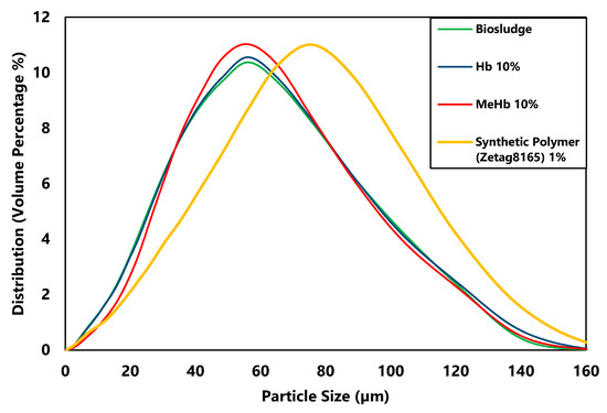 Figure 3 shows the difference between biosludge and conditioned biosludge at 10% dosage of Hb and MeHb. The most abundant size present in this biosludge was around 55 µm, and the largest was 160 µm. Although the upper and lower limits remained the same after conditioning, with MeHb, there was a slight shift from small particles (<30 µm) to medium size particles (30–70 µm). On the other hand, for Hb, no change in the particle size distribution was observed, which is consistent with the results from crown press.