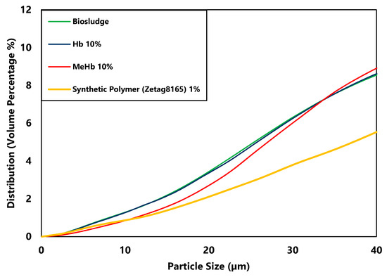 Particle size distribution of raw biosludge and conditioned biosludge with 10% of hemoglobin and methylated hemoglobin within the range of 0–40 µm.