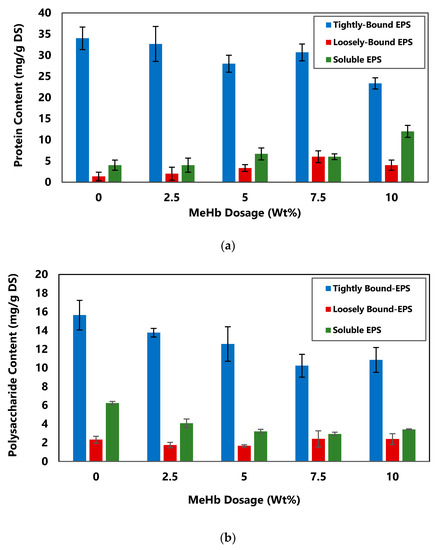 (a) Protein content and (b) polysaccharide content of EPS in biosludge at different dosage of methylated hemoglobin.