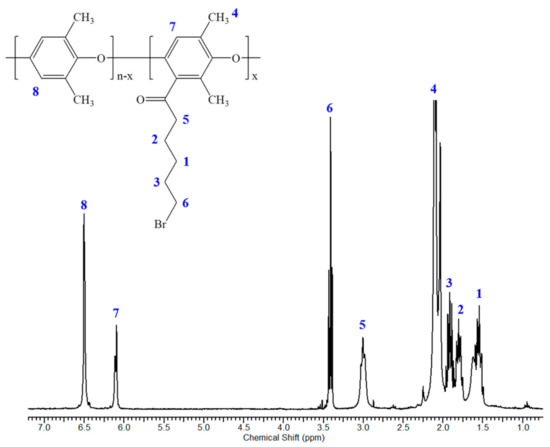 Figure 2 shows the 1H-NMR spectrum of the Ac-PPO polymer. In the Figure 2, the peak at 6.45 ppm was assigned to the aromatic proton peak of the PPO polymer (2H, Ar-H). Following Friedel-craft acylation, the proton peak of the acylated aromatic proton showed at the 6.06 ppm (1H, Ar-H). Furthermore, the peaks at 2.93 and 3.36 ppm were assigned to the additional protons adjacent to the carbonyl group (2H,–CH2–) and the bromine (2H,–CH2–). In addition, the degree of substitution was determined from the integral area values ratio of the peak at 6.45 and 6.06 ppm [35].