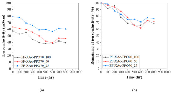 As can be seen in the Figure 8, the decrease in conductivity after 800 h of the PF-XAc-PPO70_25 was small compared to other samples. In detail, it decreased by 24% compared to the initial conductivity value. As observed in Figure 8, PF-XAc-PPO70_25 exhibited about 76% of initial conductivity value after exposed in 1M KOH at 60 °C for 800 h could be due to the steric hindrance offered by the crosslinking structure which can reduce the access of nucleophilic attack to the functional groups by the excess amount of OH− and protect the backbone [50]. Moreover, the presence of water also has important role in hydroxide ion attack on membranes. PF-XAc-PPO70_25 is found to have a better alkaline stability than PF-XAc-PPO70_50 and PF-XAc-PPO70_100. The higher water uptake and improved solvation environment for OH– in PF-XAc-PPO70_25 would retard the degradation of cation and result in higher alkaline stability [51].