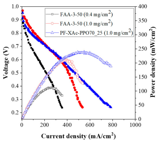 Finally, a single cell test was conducted to check its applicability in the AEMFC using the PF-XAc-PPO70_25 with the overall best properties in H2/O2 feed gas under 100% RH and 60 °C conditions. As can be seen in Figure 9, the MEA using PF-XAc-PPO70_25 showed an open circuit voltage (OCV) of 0.96 V and a peak power density of 239 mW/cm2 at ad current density of 549 mA/cm2. These results were much higher than those obtained from the commercial Fumatech FAA-3 membrane (392 mA/cm2 of current density and 212 mW/cm2 of maximum power density). (In the case of the Pt catalyst loading of 0.4 mg/cm2, a current density of 266 mA/cm2 and a peak power density of 114 mW/cm2 were shown [4].)