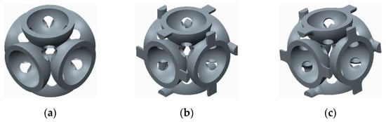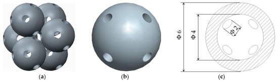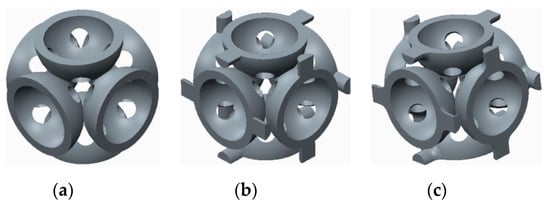 In the following paragraphs, the six types of lattice cells that were analysed are described, each one having a structure based on spheres. In order to allow the removal of the AM support material, eight small holes were introduced into the bodies of the spherical elements (Figure 1).