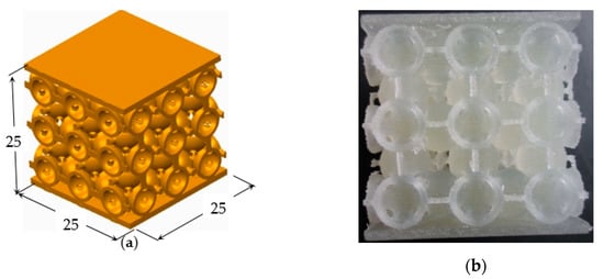 After manufacturing of all the samples, each one was subjected to a compression test. In order to homogenize the compression test results and to decrease the error rate, a compact “sandwich structure” was designed for all six groups of samples. In this set-up, two parallelepiped panels were attached to the top and the bottom of the lattice structure, as shown in Figure 5.