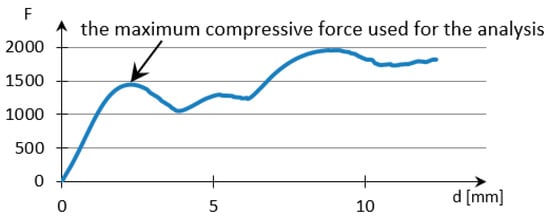 The analysis of samples was completed only on the first portion of the load, until the first sign of structural damage appeared, namely until the first crack appeared on the workpiece surface. This situation is evidenced by the appearance of the first point of maximum on the loading graph. The maximum compressive force for all of the samples was taken from this position for further analysis (Figure 7).