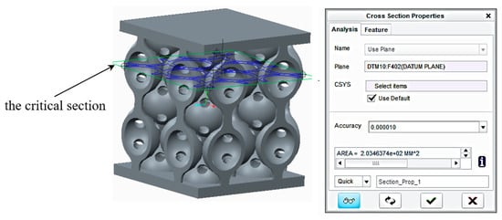 Additionally, the FEA results showed that the most critically stressed section was the contact area between the spheres. Therefore, the samples were sectioned with a plane defined by the contact points of the spheres, and the result was a sectional area of 203.5 mm2 (Figure 13).