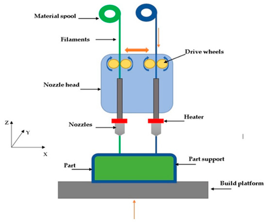 FDM was invented and developed by S. Scott Crump (co-founder of Stratasys) in 1988 [21]. This process is user friendly and is available from desktop to large size depending on the requirement. Machine cost is started from less than $1000 to $20,000. This technology consists of different components as shown in Figure 1 [22]. Stepper motors, filament material, nozzle(s), and heater are the main components of FDM. The most effective part is the extruder (nozzle). The machine can have one or two extruders based on needs. Usually, the second nozzle is used to print the support structure.