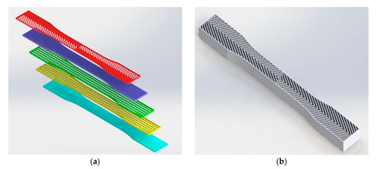 The first and the last pattern had 1.25 mm thickness while others were 1.5 mm, respectively. Each layer was designed separately and all of them were combined to make the final product for the printing process. Figure 5a,b show the classification of each layer in the dog bone product and the final design of the sample which was used to be printed by FDM machine. The order of the layer was started with solid, honeycomb, wiggle, grid, and rectilinear. It should be noted that designing layers is important to avoid gaps and voids due to the different patterns. Thus, combining patterns should be done by proper assembling that each pattern attaches to the previous one.
