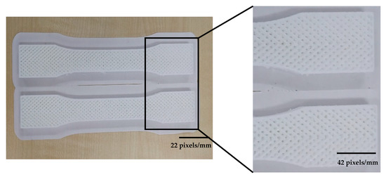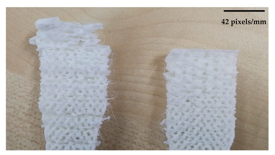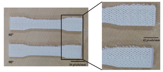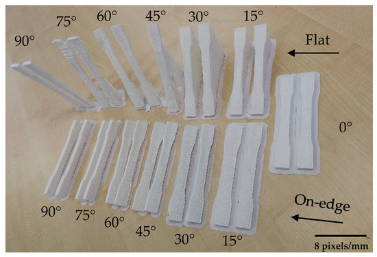 The samples were printed in flat and on-edge side in different build orientations (see Figure 6). Samples were printed by following these two sides to determine the effect of combined patterns on the product’s strength. CuraEngine® software (4.5 version, Ultimaker, Geldermalsen, Netherlands) was used to slice the CAD design and prepare the printing parameters which were constant for all specimens, as shown in Table 3. Solid infill (100%) was chosen to determine the patterns that were designed and the following parameters are conducted from the supplier’s catalog. A total of 42 samples were printed by FDM machine for each orientation and a set of samples is shown in Figure 7. In perpendicular samples, the machine used support structure to avoid the material drops. Thus, this may affect the surface texture and mechanical properties of final products.