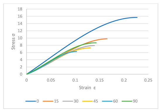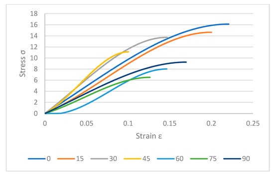 As shown in Figure 12, fatigue and crack in random samples are recorded to show the fatigue’s line and the exact place that the parts cracked. The reason that samples were crack at different points was due to the effects of build orientation on layer adhesion. This means by changing build angle, the strength between each layer becomes weaker and it leads to different results. Besides, samples were printed in two directions which had a great effect on mechanical properties. All samples were analyzed one by one to determine the strength of each orientation under tensile load. Three specimens were analyzed in each angle and the final loads were recorded accordingly. Therefore, the average maximum tensile load for flat samples is recorded in Table 5 to clarify the differences. Meanwhile, Table 6 shows the differences in maximum tensile load in on-edge printed specimens. As shown in Table 5, by increasing the build orientation the strength and stiffness of printed specimens became weak. The average value for forces and extensions of three samples was conducted by the trendline equation for 3 graphs. In flat specimens, the strongest sample was 0° while the weakest was 60° with the average value of 1427.68 N and 570.77 N with the displacement of 11.34 mm and 5.13 mm, respectively. Due to the defect that was mentioned before, 75° flat samples were not investigated. Moreover, the same results happened for on-edge parts under tensile loads. This means, by increasing the build orientation, the stiffness becomes weak. The highest value was recorded for 0° with 1466.23 N and the lowest one belonged to 75°. These results happened due to the poor layer adhesion and also the differences in infill patterns for each angle. On the other hand, after 60° and 75° angle, higher loads were needed to break the samples. In 90° angle, for both flat and on-edge sample the value of fatigue was higher compared to 60° and 75°. In brief, by printing in horizontal direction better adhesion and stronger samples can be achieved [66]. Meanwhile, by looking at the results, it can be concluded on-edge parts were stronger compared to flat ones. For example, 15° samples in flat printing cracked at 890.29 N while they cracked at 1332.67 N in on-edge samples. To examine the tensile process, stress–strain charts for both flat and on-edge parts are provided to determine the effects of combining infill patterns on mechanical properties.