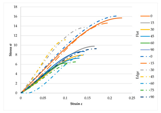 Figure 13 shows the variety of loads that were needed to crack specimens. The maximum stress was recorded for 0° which was around 16 MPa while it was less than 10 MPa for others. Thus, by increasing the build angle, the layers adhere poorly so a lower load was needed to break the samples. Meanwhile, the same thing happened for on-edge samples but they showed better results compared to flat samples in perpendicular ones. Samples required higher loads to crack completely and were stronger in layer binding. As shown in Figure 14, 15° specimen needs more than 14 MPa which is close to 0° angle. Besides, other on-edge samples were in better condition in stiffness and strength. The worst sample in flat samples was 60° and for on-edge specimens was 75° angle. In brief, the best quality and properties were achieved for 0° angle. The best quality of samples was good at 0° in flat printing [45]. However, printing complex and combined patterns can be done at this angle, the 3D printers are not capable of combining different patterns in a product.