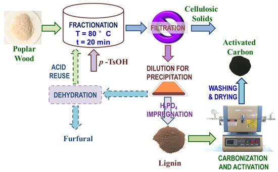 AHF of Wiley-milled poplar wood using p-TsOH [23,26] was carried out according to the experimental schematic flow diagram shown in Figure 1 to produce theoretically sulfur-free AHL for activation study. The 500 g p-TsOH solution at 80 wt.% concentration was prepared in a 1000 mL flask by solubilizing required amounts of p-TsOH in deionized (DI) water. The flask was placed on a temperature-controlled shaker (Model 4450, Thermo Scientific, Waltham, MA, USA) at 250 rpm to promote p-TsOH dissolution. Then, 50 g (air dry basis) poplar sample was fractionated in the prepared p-TsOH solution with continuous shaking at 80 °C for 20 min. At the end of the preset reaction time, 1 L DI water was added into the flask to dilute the fractionation solution to terminate reaction. The water insoluble solids (WIS) from fractionation were separated from the AHF spent liquor through filtration. The filtrate was diluted to 5 wt.% p-TsOH concentration to precipitate lignin. After centrifuging, the precipitated lignin was dialyzed in DI water for one week and oven dried at 50 °C for later activation. The lignin-free spent liquor can be used for producing furfural and recycling p-TsOH [26].